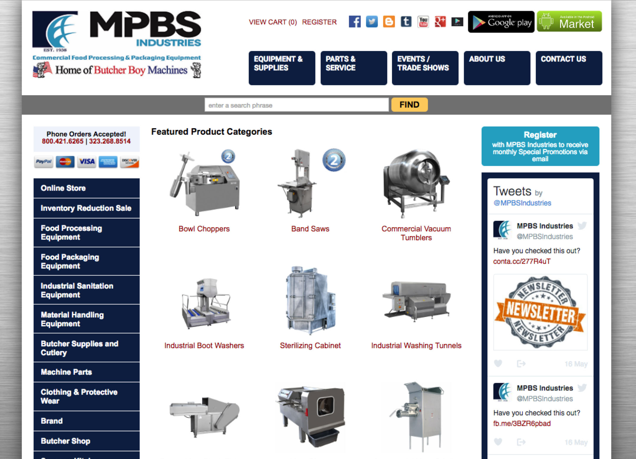 A custom-built, searchable product catalog website for a company that sells meat processing and packaging equipment and butcher supplies. Includes a cart to which users can add products to submit and get price quotes.